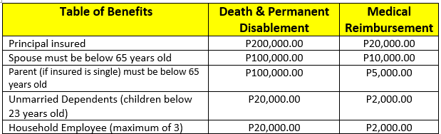 - Will pay up to a maximum of Php200,000.00 annual aggregate for accidental death and permanent disablement from accidental means inside or outside the covered unit, including expenses for medical and surgical treatment for such injury, as well as Burial expense up to Php10,000.00 per person