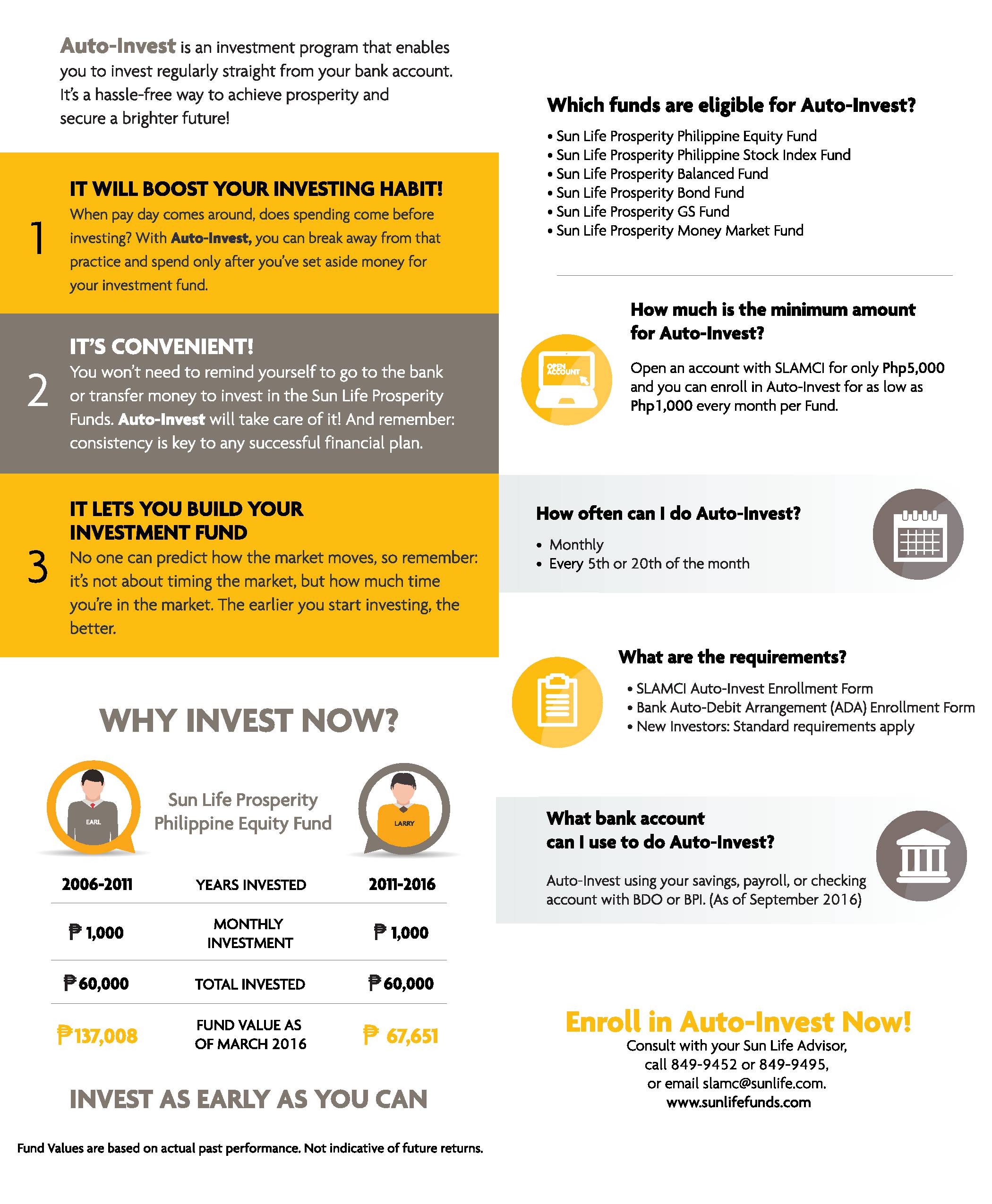 - Download, print and fill out the 2 required forms: a) Autodebit Service Enrollment form b) Sun Life Prosperity Funds Auto-Invest Enrollment Form . The forms are also available in any Sun Life customer center or through your mutual fund agent. Accomplish three copies each.